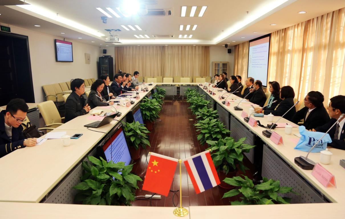 吴松首先代表学校欢迎泰国代表团的到来,简要介绍了我校对外合作的相关情况,并指出我校与泰国高校的合作还有很大的扩展空间。宋卡大学校长Chusak Limsakul博士也表示十分感谢我校的热情接待,此次来访希望考察学校的教育体制及理念,学习中方教学、管理等先进经验,加强双方教育领域的交流与互鉴。随后孙跃东介绍了学校历史、教学科研概况、国际交流与合作、跨文化交流等情况。教务处介绍了我校本科人才培养和教学改革的相关情况。研究生院介绍了校内研究生的教学与科研发展情况。国际交流处介绍了校留学生的基本概况与招生流程。此后双方还就两校学生互换等问题进行了交流。